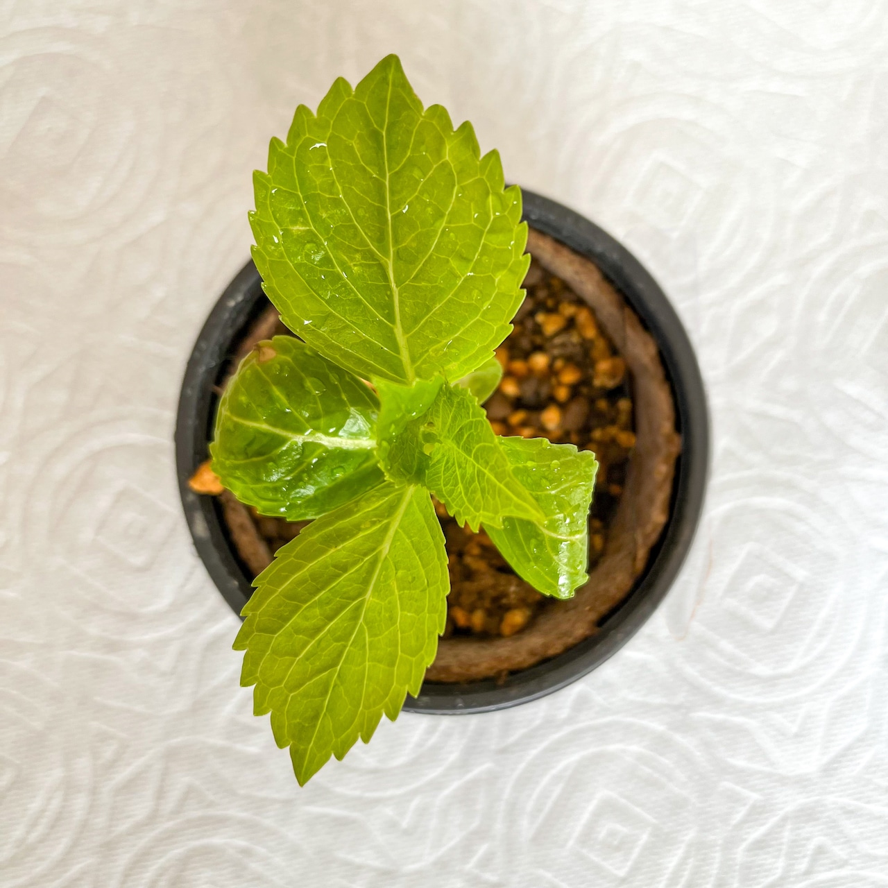 ガクアジサイの一種「八丈千鳥」の挿し木後約1年の物苗木です。