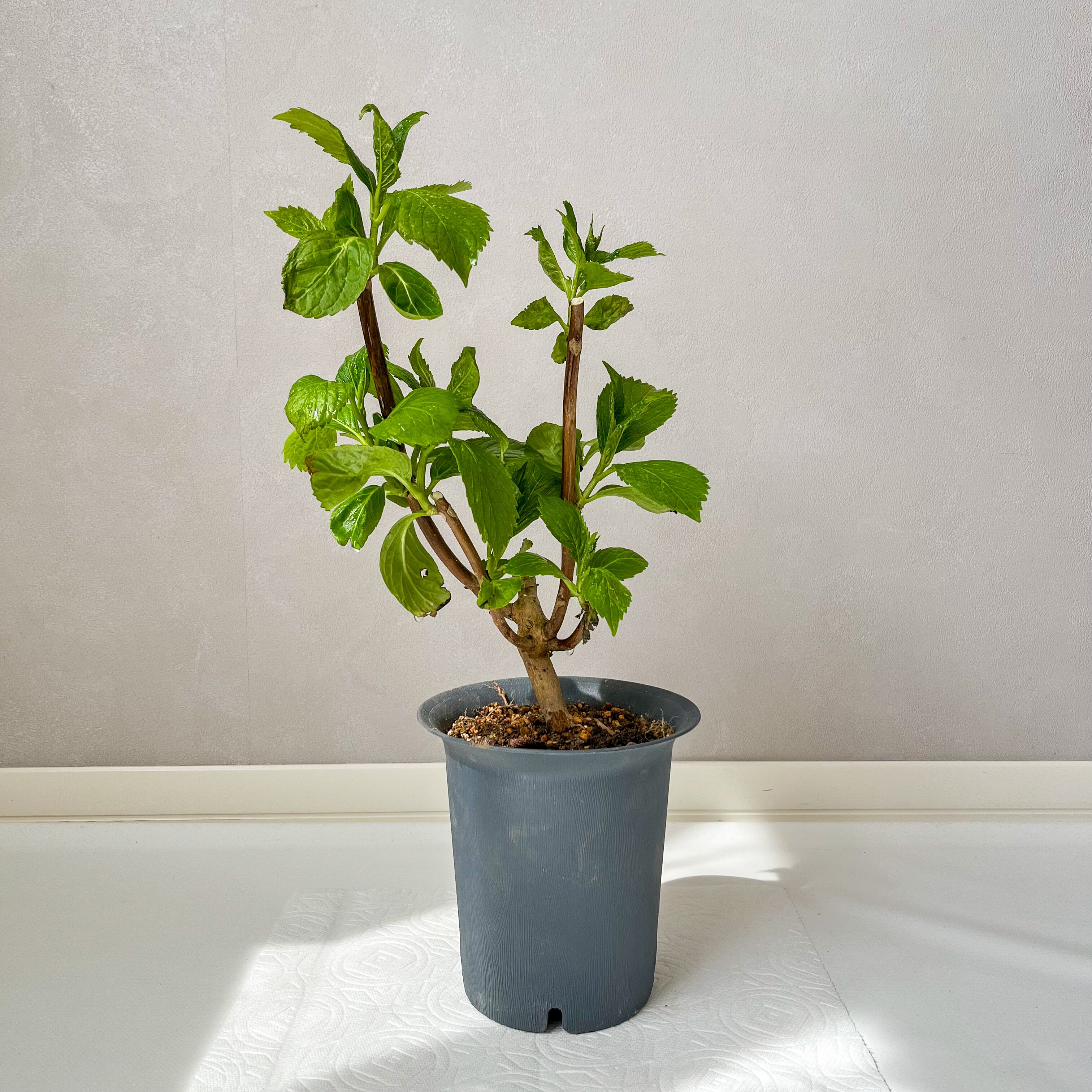 ガクアジサイの一種「八丈千鳥」の蕾付き小型株(樹高50cm未満)です。